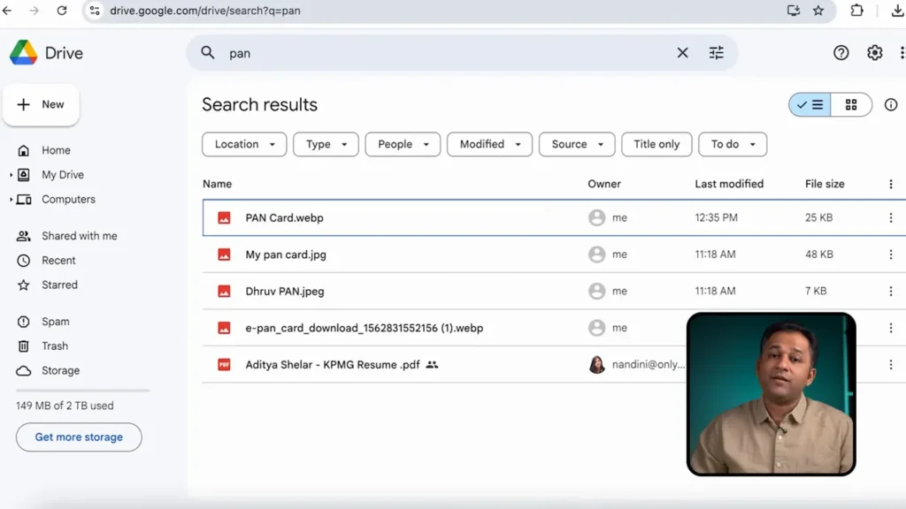 рдКрдкрд░ рд╕рд░реНрдЪ рдмреЙрдХреНрд╕ рдореЗрдВ рдХрд┐рд╕реА рдХреАрд╡рд░реНрдб (рдЬреИрд╕реЗ тАШрдкреИрдитАЩ) рдЯрд╛рдЗрдк рдХрд░реЗрдВред рд╕рд░реНрдЪ рдореЗрдВ рдЖрдк Location (Shared with me, My Drive), Modified date рдФрд░ Title only рдЬреИрд╕реЗ рдлрд╝рд┐рд▓реНрдЯрд░реНрд╕ рд▓рдЧрд╛ рд╕рдХрддреЗ рд╣реИрдВред рдЕрдЧрд░ Title only рдЪреБрдирддреЗ рд╣реИрдВ рддреЛ рдХреЗрд╡рд▓ рдлрд╛рдЗрд▓ рдирд╛рдо рдореЗрдВ рдореМрдЬреВрдж рд╢рдмреНрдж рджрд┐рдЦреЗрдВрдЧреЗред